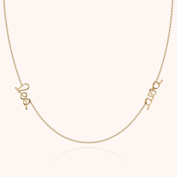 Customize your Richelieu Duo necklace with two names, a message, or a unique combination of two words. Each letter is handcrafted from laminated yellow gold wire, then mounted on a delicate 45 cm chain. A symbolic creation, to be worn close to the heart or offered as a precious link between two stories.