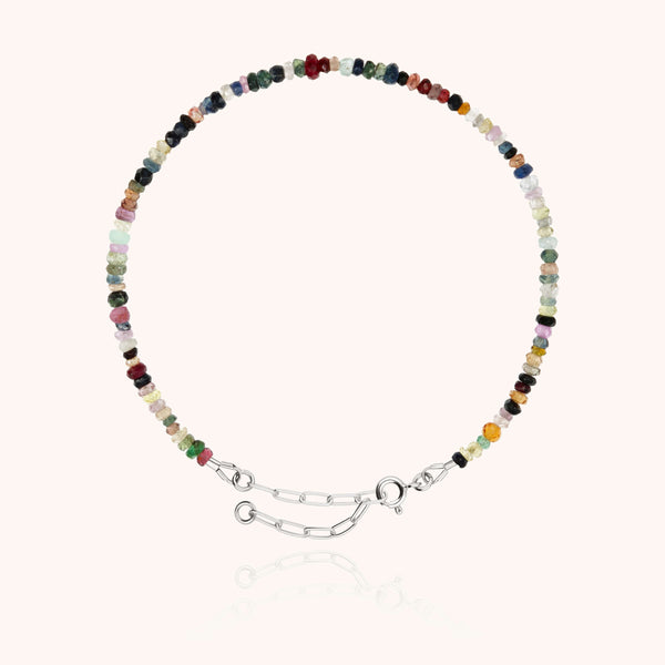 Le bracelet, inspiré par les codes de la collection Nonza, arbore des finitions en argent sterling 925. Il capture l'essence de la collection en mélangeant les teintes du saphir, de l'émeraude et du rubis pour donner naissance à des créations uniques. Les pierres précieuses utilisées pour la création du bracelet sont de forme, de taille et de couleur différentes, conférant à chaque pièce une allure résolument contemporaine. Cette création évoque la simplicité et la préciosité des colliers de rocailles de notre enfance, réinterprétant ces souvenirs d'une manière simple, précieuse et légèrement nostalgique.
