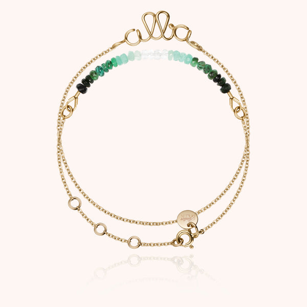 Le bracelet double tour personnalisé et son dégradé d'émeraudes sont montés sur une chaîne délicate qui embrasse votre poignet. Les pierres précieuses du bracelet sont sélectionnées et assemblées à la main dans notre atelier parisien.