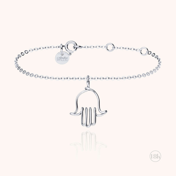En or blanc 750/1000, la main de Fatma se fait bijou de pureté et de lumière. Ce bracelet chaîne façonné à la main incarne la protection et la paix intérieure, un talisman intemporel signé Atelier Paulin.