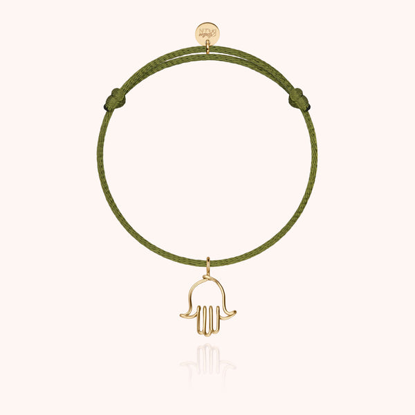Le symbole protecteur de la main de Fatma s’habille ici d’or jaune laminé 585/1000. Façonné à la main dans les ateliers de la Maison, le pendentif repose sur un cordon coloré ajustable. Ce bracelet, empreint de spiritualité, évoque la paix intérieure, la bienveillance et la chance.