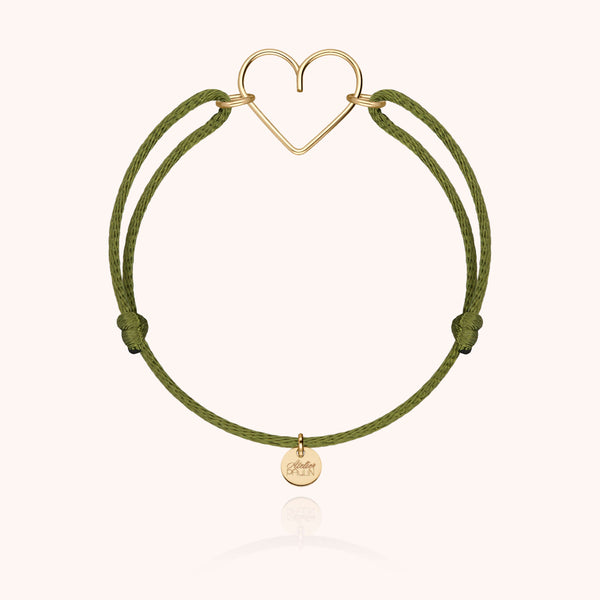 Le fil d'or prend la forme d'un symbole intemporel, généreux et merveilleux. Le pendentif cœur est monté sur un bracelet cordon en coton coloré.