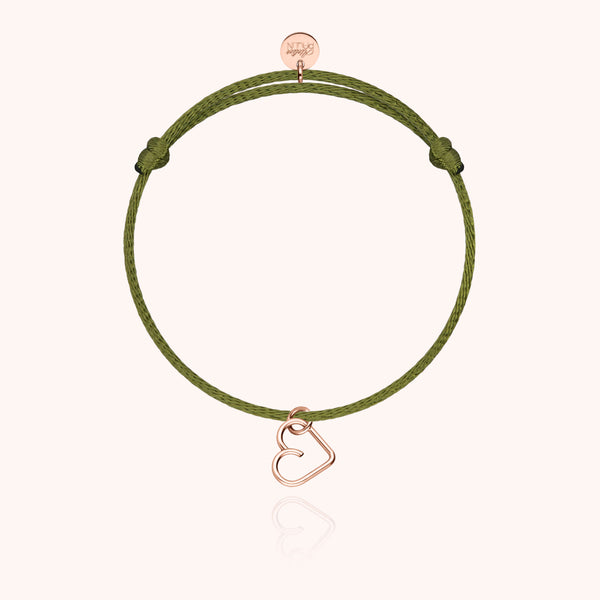 Délicat et romantique, le bracelet cœur en or rose laminé 585/1000 exprime la douceur des émotions. Chaque pendentif est façonné à la main et monté sur un cordon coloré réglable pour une touche de tendresse à votre poignet.