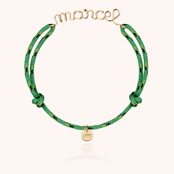Le bijou personnalisé pour homme, en version précieuse. Ce bracelet en or jaune 750/1000 est bien plus qu’un accessoire : c’est une pièce d’exception, façonnée à la main pour devenir un bijou unique et chargé de sens. Pensé pour l’homme contemporain, il se compose d’un cordon Knot masculin et d’un mot, d’un prénom ou d’initiales écrits en fil d’or 18 carats, plus épais (1.0 mm) pour plus de présence et de caractère.