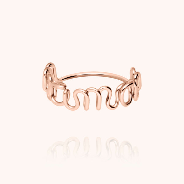 La bague à personnaliser d'un mot, d'un prénom ou d'initiales est façonnée d'un fil d'or par les artisans de la Maison. Modèle iconique, la bague "maman" est porteuse de précieux messages.
