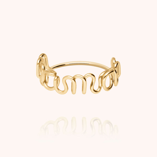 La bague à personnaliser d'un mot, d'un prénom ou d'initiales est façonnée d'un fil d'or par les artisans de la Maison. Modèle iconique, la bague "maman" est porteuse de précieux messages.