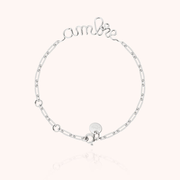 Le bracelet Richelieu prend une nouvelle dimension avec sa chaîne Rectangle en argent sterling. Élégant et structuré, il souligne la délicatesse du fil travaillé à la main, qui forme votre mot personnel. Une pièce sur-mesure, façonnée à Paris, pensée pour être gardée près de soi ou offrir à un être cher.