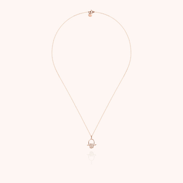 En or rose laminé 585/1000, la main de Fatma se pare d’une lumière douce et féminine. Ce collier symbolique, entièrement façonné à la main, incarne la protection, la chance et la beauté des liens précieux.